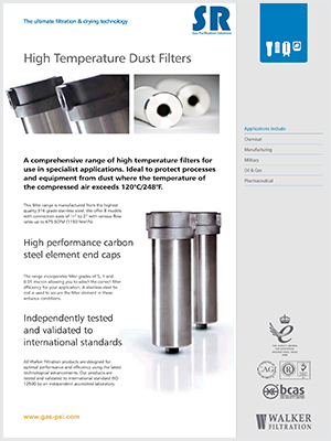 SR高溫除塵過濾器是用最高品質(zhì)的316不銹鋼制成,最高工作溫度可以達(dá)到250℃(482℉),最高工作壓力為16barg(232psig)。一共有8種型號,接口尺寸從1/4"至2",流量范圍從35Nm3/h(20SCFM)到1150Nm3/h(675SCFM)。