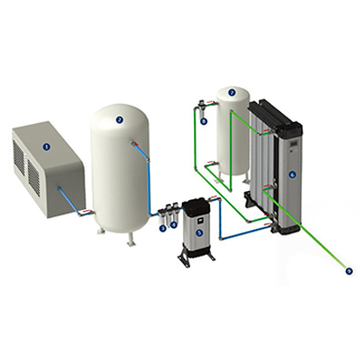 要在儲氣罐后安裝英國WALKER三級壓縮空氣過濾器,使得過濾后的壓縮空氣符合ISO 8573-1:2000顆粒等級的1級標準,固體顆粒小于0.01μm,含油等級也為1級標準,最大含油量0.003mg/m3;壓縮空氣干燥,要在SRA三級壓縮空氣過濾器后加裝SR模塊化吸干機?,這種吸干機是英國制造的無熱吸附式干燥機,利用變壓吸附原理實現壓縮空氣的干燥,一般壓力露點可以達到-40℃,更高的壓力露點為