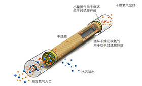SR CMD滲膜式干燥器是由中空纖維高分子膜絲纏繞而成,通過滲膜基體材料上面的特殊涂層達到氣體分離的高選擇性,除水蒸氣外,其它氣體分子的滲透均收到限制,氧氣和氮氣不能通過滲膜擴散