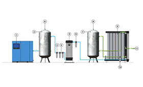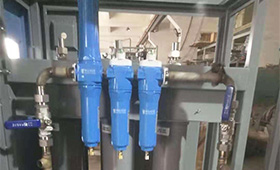 制氮機生產氮氣的原理解析:兩排成對的裝滿碳分子篩(CMS)的壓鑄鋁筒通過上下的均氣上蓋和底座連成整體,形成一個雙套分離系統。壓縮空氣通過底部的均氣底座進入“在線”系統,在碳分子篩間流動,其中的氧氣被碳分子篩優先吸附,而氮氣則可以順利通過碳分子篩。整個分離系統每隔一段時間(預設),控制系統自動切換