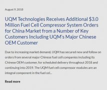據美國UQM公司官方網站報道,當地時間8月13日,美國UQM技術公司宣布,其收到了新客戶及現有客戶(包括其主要的中國原始設備制造商客戶)關于新型車用燃料電池空氣壓縮機系統的價值約30